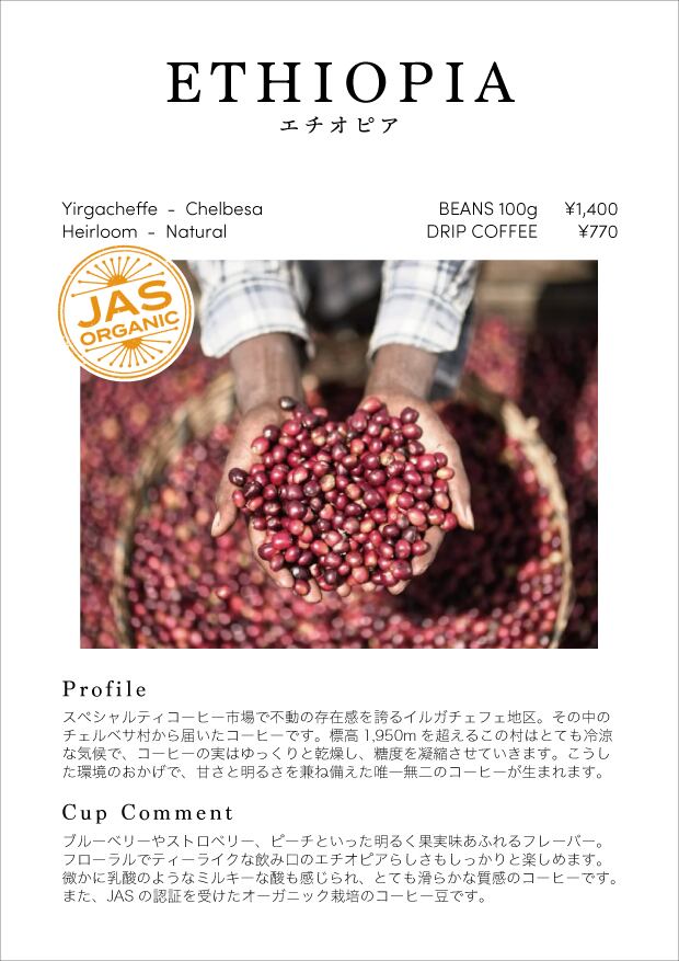 スペシャルティコーヒー市場で不動の存在感を誇るイルガチェフェ地区。その中のチェルベサ村から届いたコーヒーです。標高1,950mを超えるこの村はとても冷涼な気候で、精製の過程でコーヒーの実はゆっくりと乾燥し、糖度を凝縮させていきます。