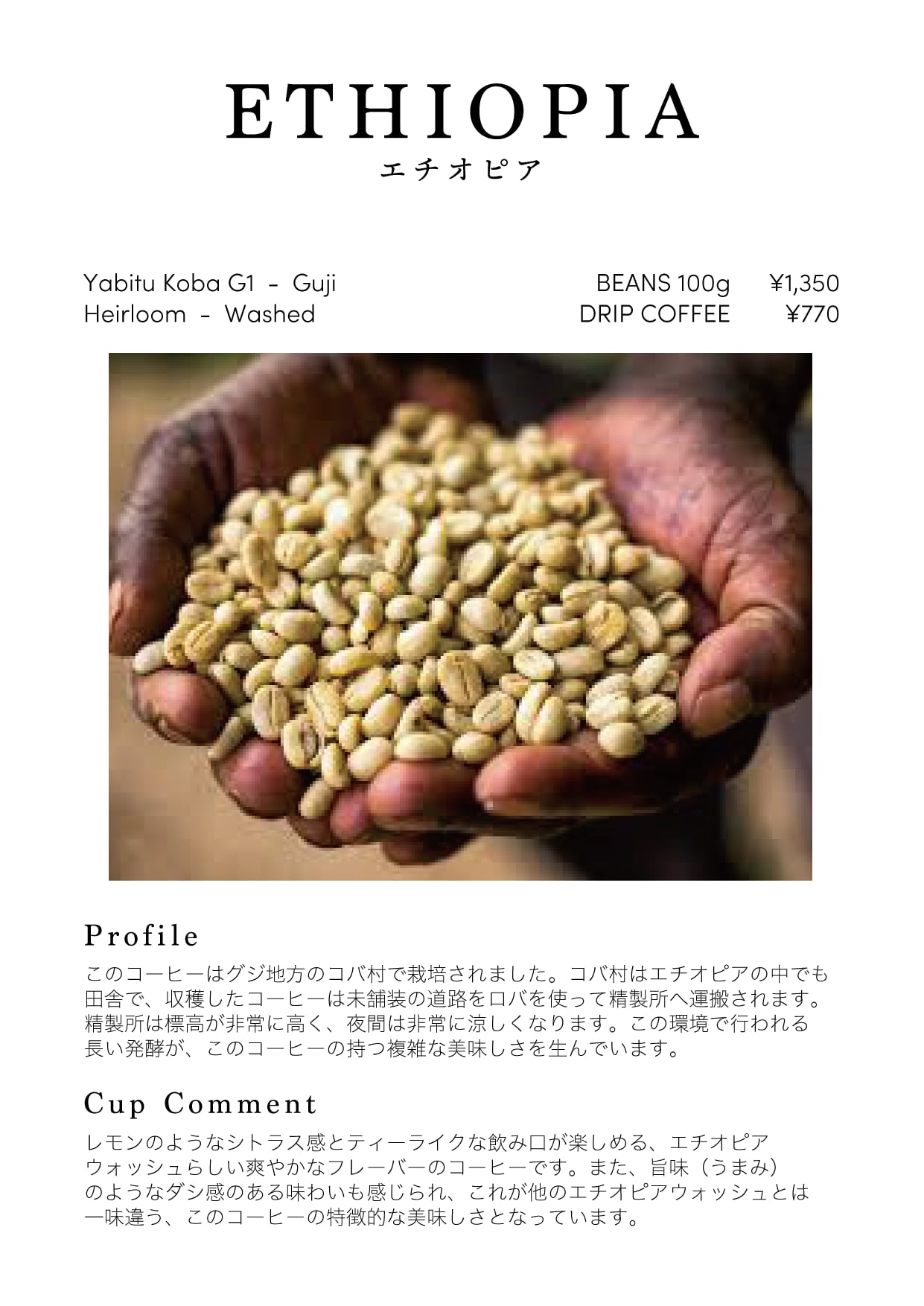レモンのようなシトラス感とティーライクな飲み口が楽しめる、エチオピアウォッシュらしい爽やかなフレーバーのコーヒーです。また、旨味のようなダシ感のある味わいも感じられ、これが他のエチオピアウォッシュとは一味違う、このコーヒーの特徴的な美味しさとなっています。