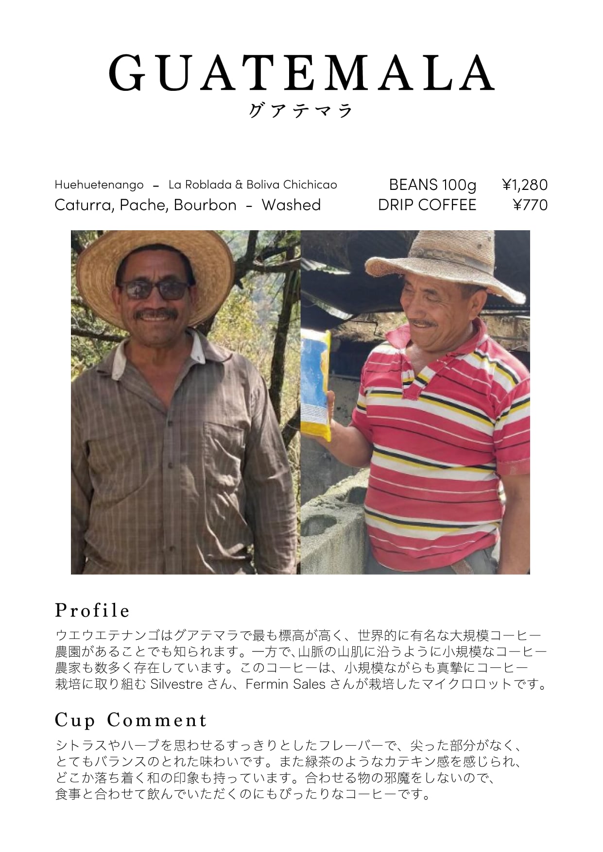 ウエウエテナンゴはグアテマラで最も標高が高く、世界的に有名な大規模コーヒー農園があることでも知られます。一方で、山脈の山肌に沿うように小規模なコーヒー農家も数多く存在しています。このコーヒーは、小規模ながらも真摯にコーヒー栽培に取り組むSilvestreさん、Fermin Salesさんが栽培したマイクロロットです。