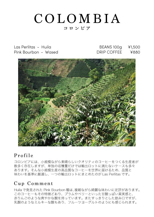 コロンビアには、小規模ながら素晴らしいクオリティのコーヒーをつくる生産者が数多く存在しますが、単独の収穫量だけでは輸出ロットに満たないケースも多々あります。そんな小規模生産の高品質なコーヒーを世界に届けるため、品質と味わいを基準に厳選し、一つの輸出ロットにまとめたのがLas Perlitasです。